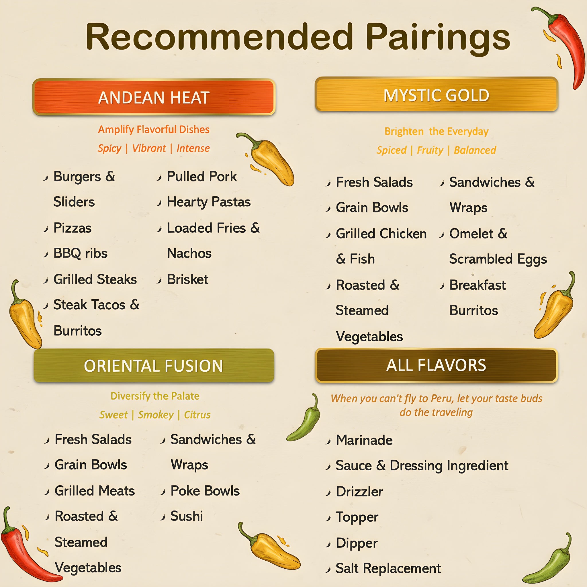 Oriental Fusion: A delicate blend of soy sauce, ginger, sesame, and Peruvian chili. Mild yet layered, it bridges Asian inspiration with Andean roots — versatile and savory.